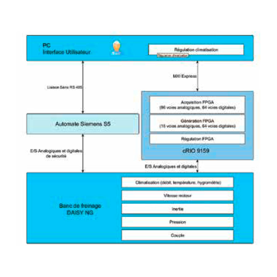 Die Echtzeitsteuerung von 1000 Pferden ist komplex und gefährlich! Ebenso müssen Druck und Drehmoment reguliert werden, während die Sicherheit der zu prüfenden Ausrüstung und der Maschine gewährleistet ist. Die Trägheitssimulation erfordert die direkte Einwirkung auf das Motordrehmoment mit einer Zykluszeit von 1 ms. Die Steuerung der Bremse (Druckbeaufschlagung und Aktivierung) und des Drehmoments entspricht einer Zykluszeit von 4 ms. Schließlich mussten alle Messungen mit einer Frequenz zwischen 10 Hz und 500 Hz erfasst, verarbeitet und gespeichert werden.